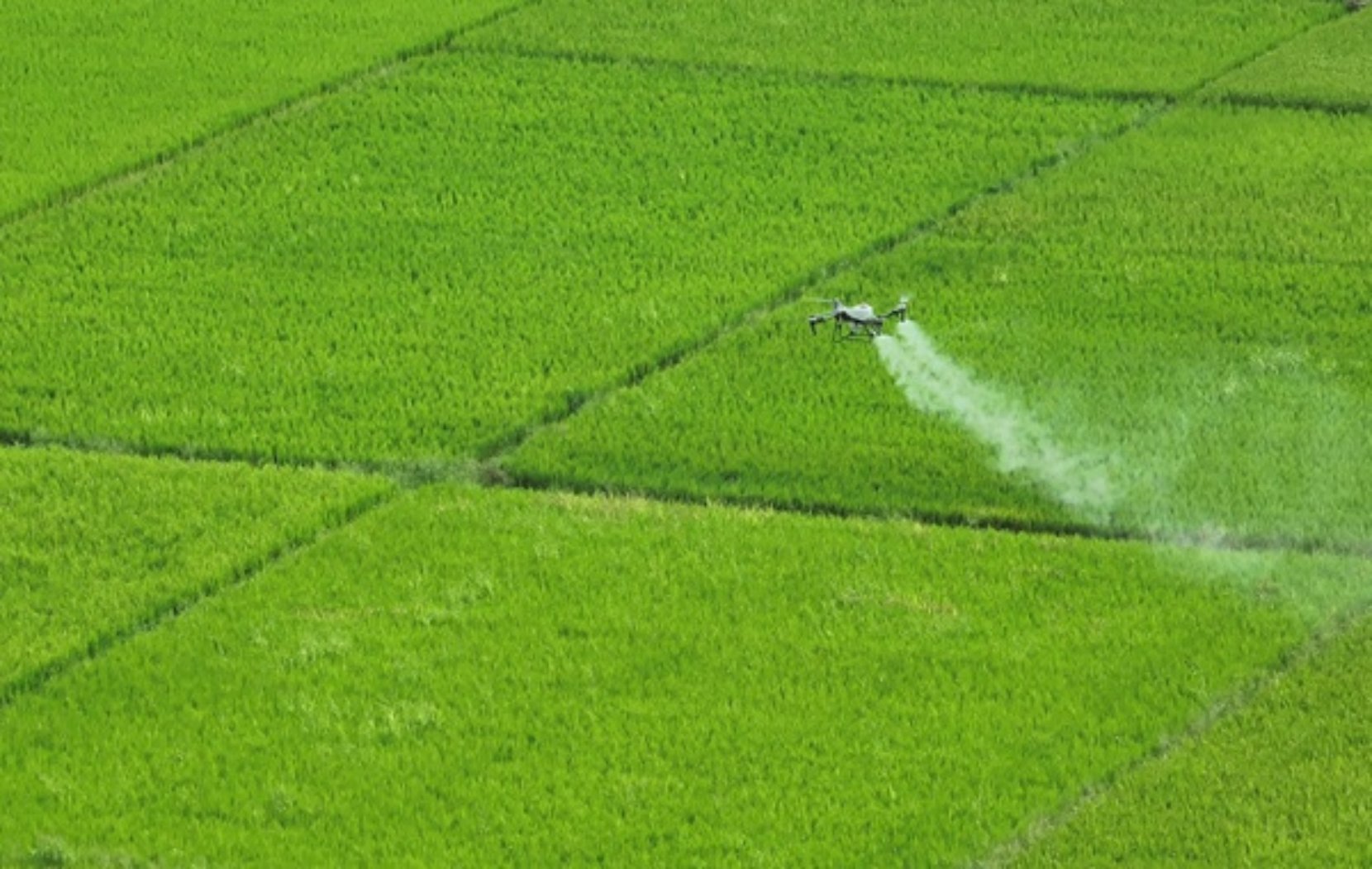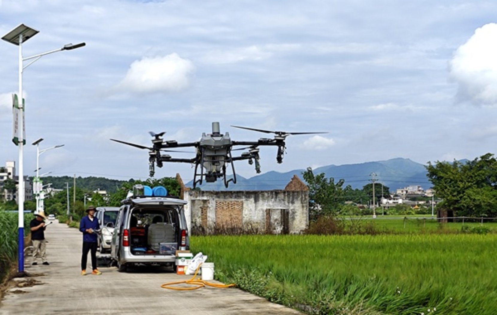 眼下正是晚稻抽穗扬花、灌浆结实、产量形成的关键时期。近日,在玉林市玉州区城北街道高山村314亩稻田里,一架植保无人机在飞手熟练操控下腾空而起,依靠北斗精准定位,按照规划路线来回快速均匀喷施肥药剂,集中开展“一喷多促”肥药剂混合喷施作业,科学防治病虫害,提升晚稻抗逆减灾能力。