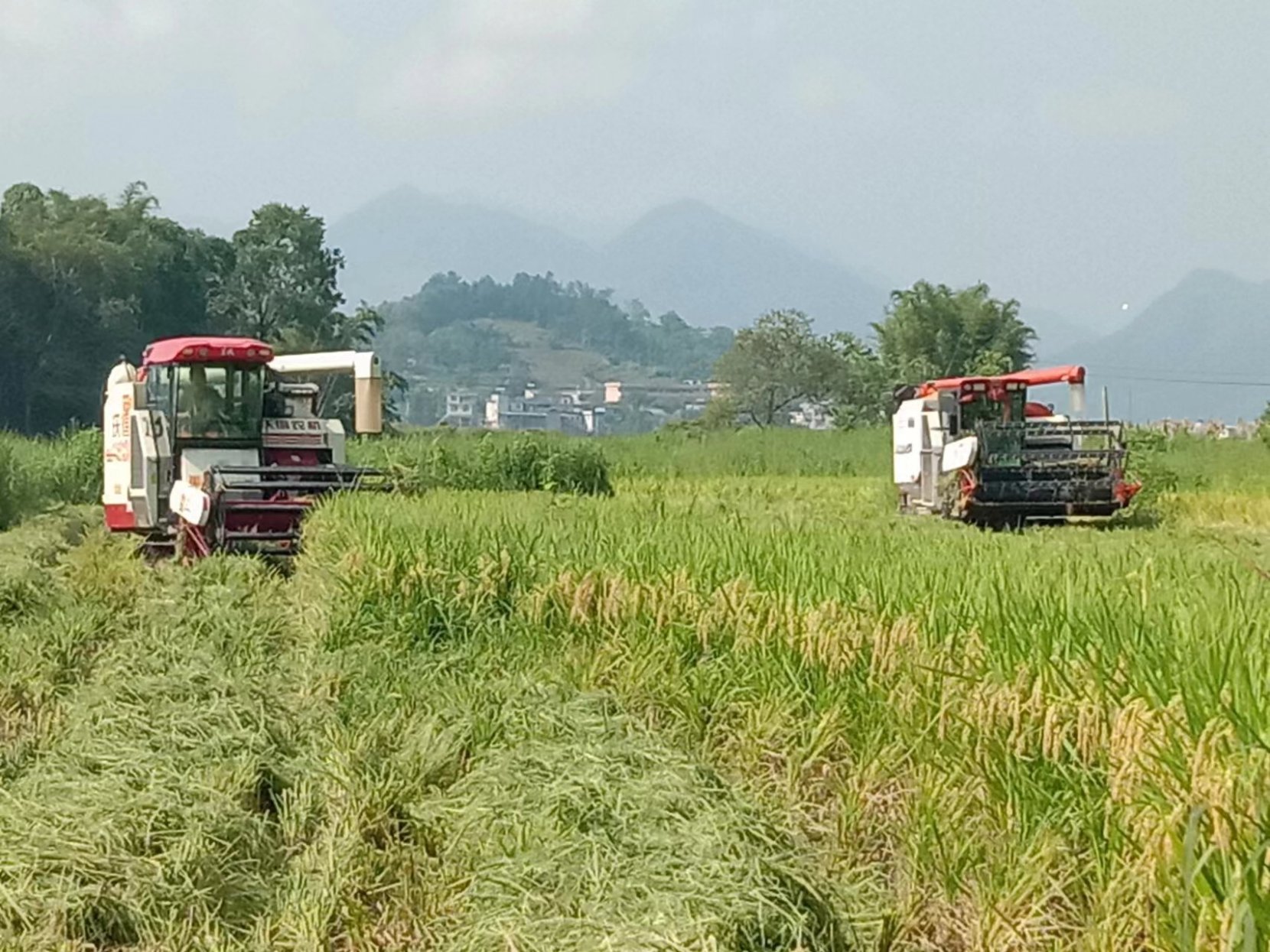 金秋十月,稻浪飘香。10月13日,在桂林荔浦市修仁镇323国道沿线的水稻种植基地,两台联合收割机正轰鸣着在金黄稻田中穿梭作业,切割、脱粒、粉碎秸秆等工序一气呵成。不到1小时,8亩稻田的稻谷便完成收割,随即由农用运输车转运至附近企业的烘干中心,开启后续加工流程。