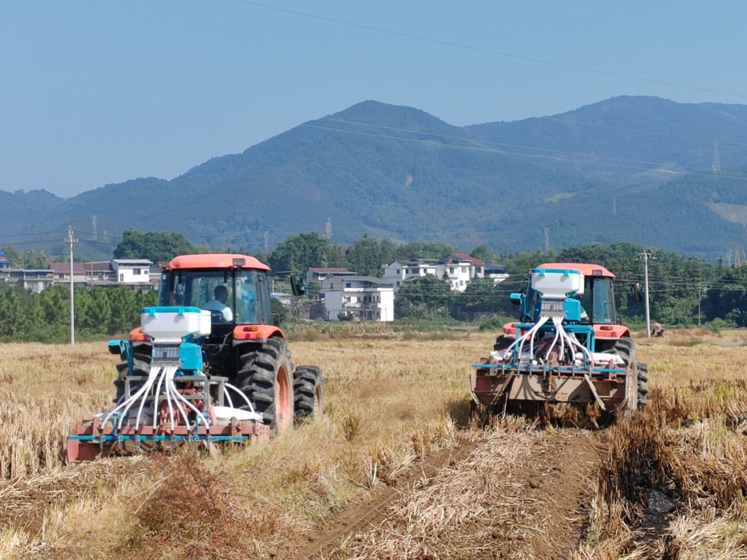 成套农机设备正在进行油菜直播作业