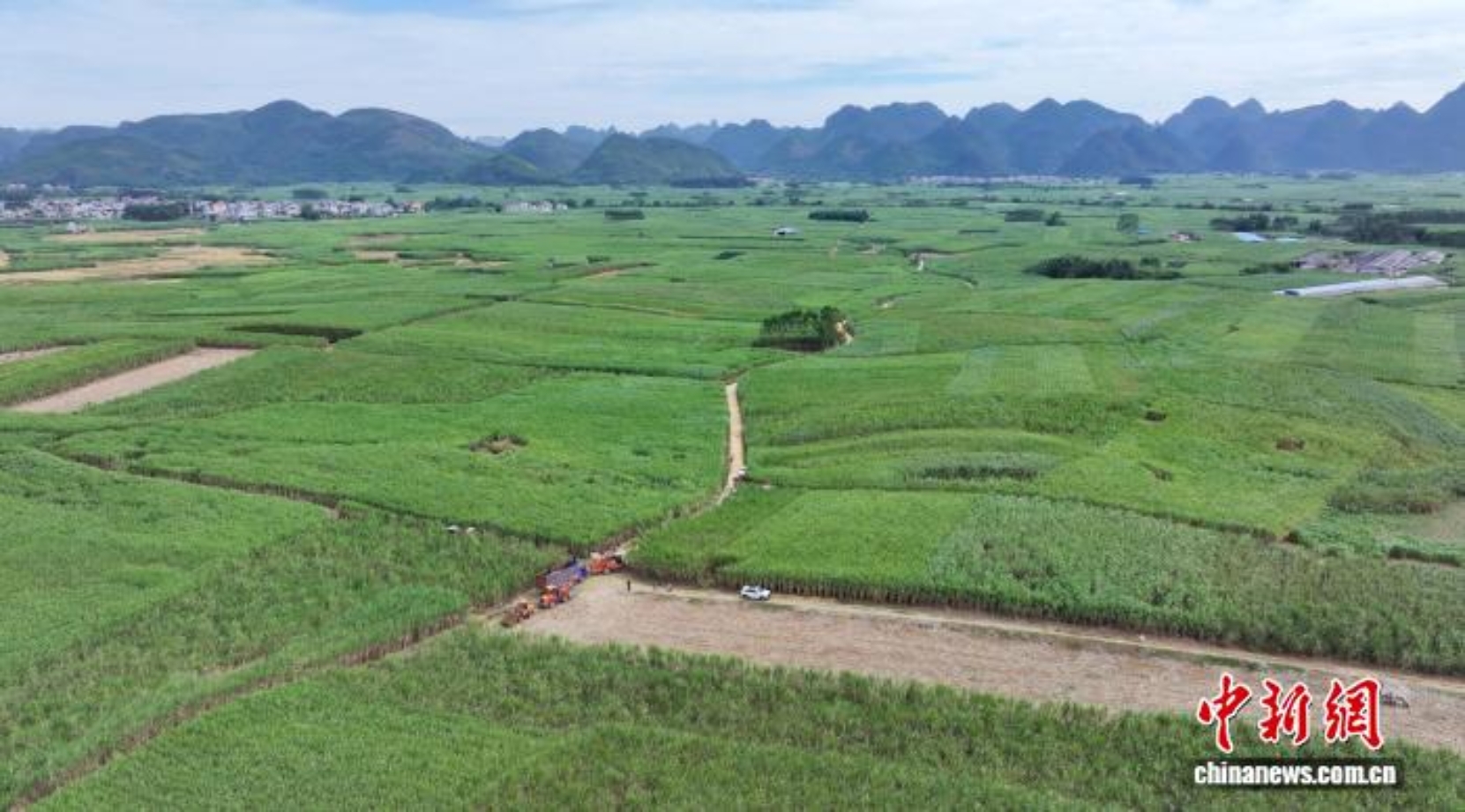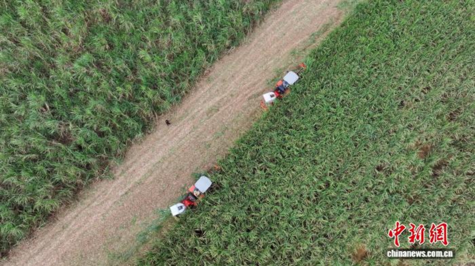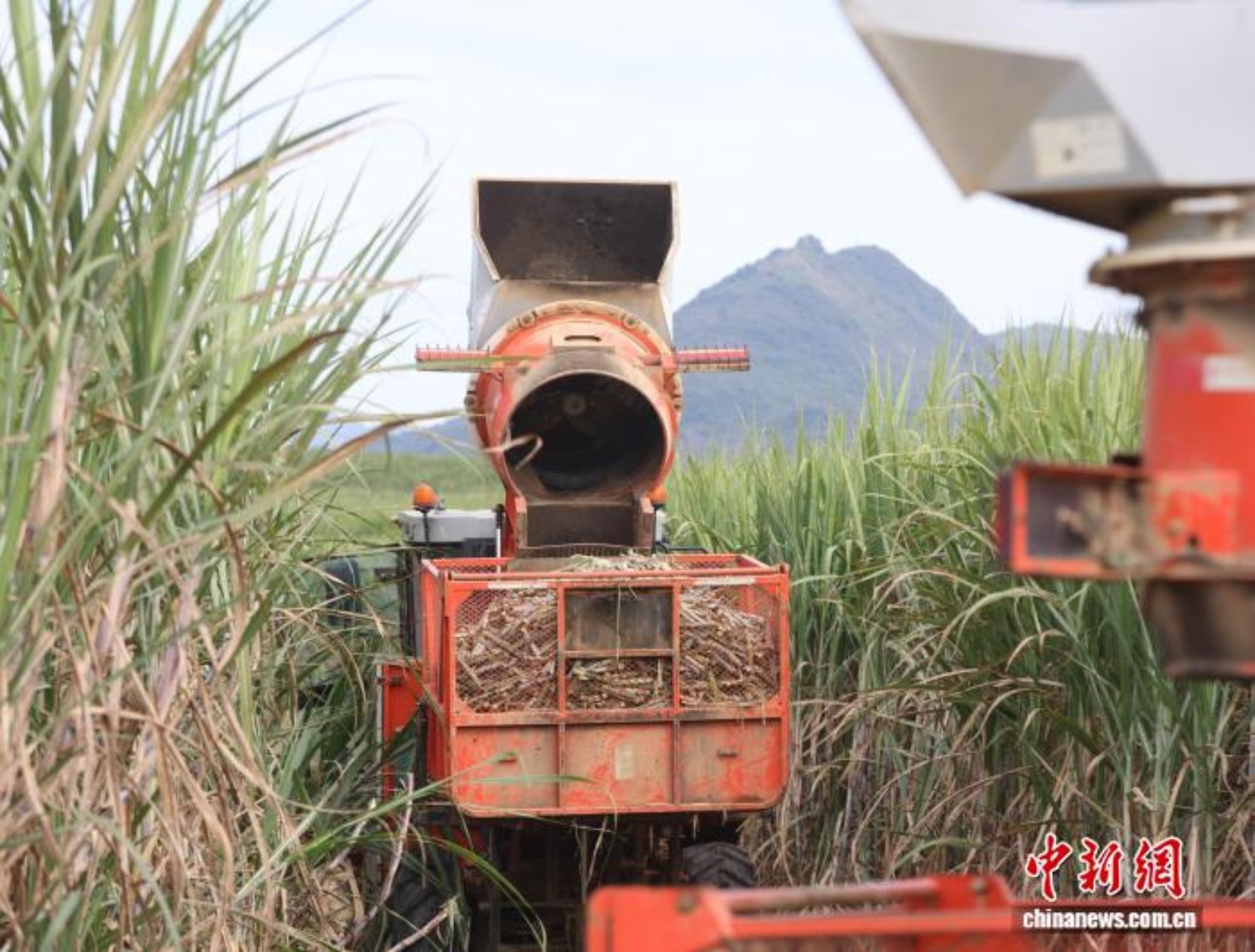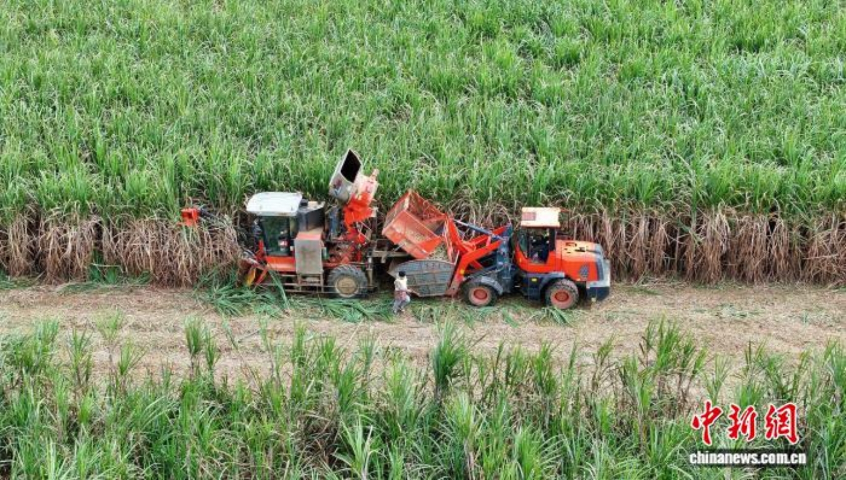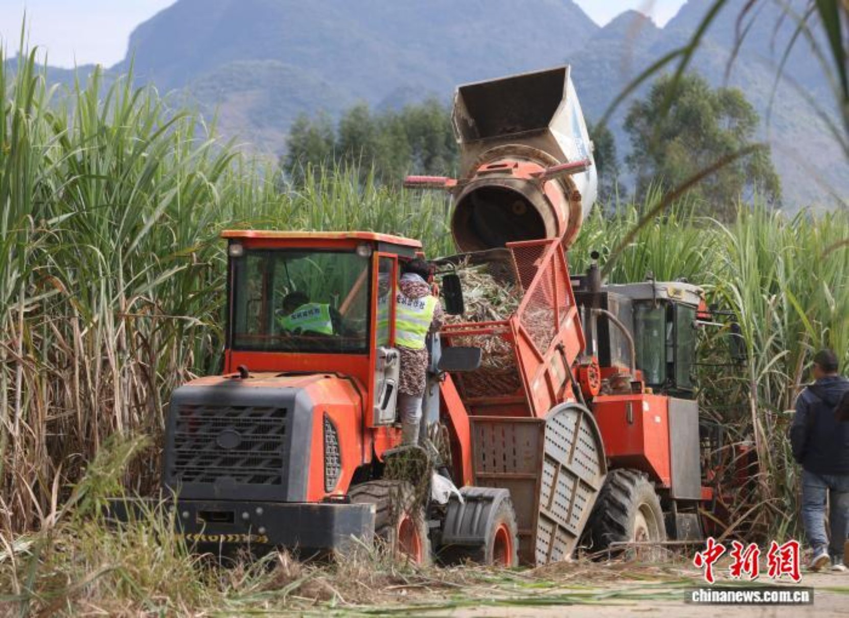 11月20日,在广西柳州市柳城县太平镇江头村,农机手操作机械收割甘蔗,铲车将收好的甘蔗倒入运蔗车中,一派忙碌的景象。作为国家糖料生产基地县和广西“双高”基地建设重点县,柳城甘蔗耕种收综合机械化水平达73.60%,机收效率是人工的数十倍。2025/2026年榨季,柳城县计划投入联合收割机100台。图为农机手操作机械收割甘蔗。汤晓逵 摄