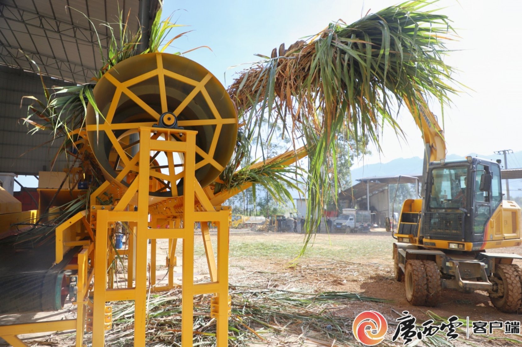 抓机将甘蔗放入分布式机收机器进行除杂、切断等处理。