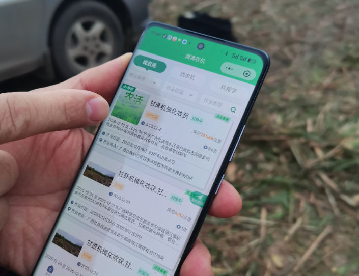 不仅是人工砍收,农机作业的调配也因数字化平台焕发新生。从“线下找活靠打听”到“线上接单靠平台”,宁明县的农机手们迎来了作业模式的全新变革。打开手机就能查看附近农活需求,一键接单后跟着导航直达作业地块,完工后线上结算即时到账,无需再为/找活、对账/耗费精力,农机作业效率大幅提升,闲置农机资源也得到了精准盘活。
