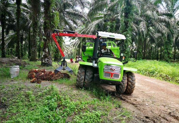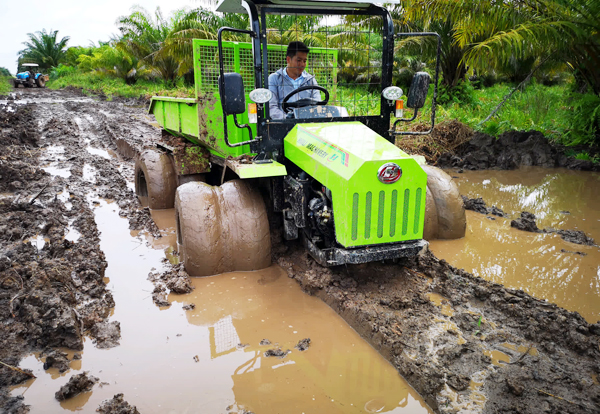 惠来宝公司生产的丘陵山地拖拉机在印度尼西亚棕榈园作业