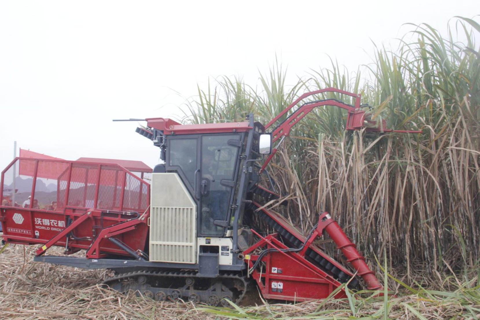 在广西罗城农丰农业机械服务专业合作社甘蔗生产基地,来自14家农机生产企业的新型甘蔗联合收获机、田间收集搬运机、移动除杂设备、翻转犁、旋耕犁、联合种植机等25台套机具设备,现场作业依次演示了成套分步式机械化收获、联合机械化收获、“深耕+旋耕”机械化集成整地、“深种+浅覆土”一体化种植等技术模式,展示如何通过“以收定种、全程适配”技术路线,构建机械化收获质量保障体系。该技术路线以收获环节的需求为导向,逆向优化前期的整地、种植和田管等,同时集成推广宿根性强、抗倒伏、宜机化的优良品种,从源头上为机收创造最佳的田间条件和甘蔗形态,从而有效破解机收“损失率高、含杂率高、破蔸率高、发芽率低”的“三高一低”瓶颈,最终实现“前期作业标准化、后期收获高效化”的目标。