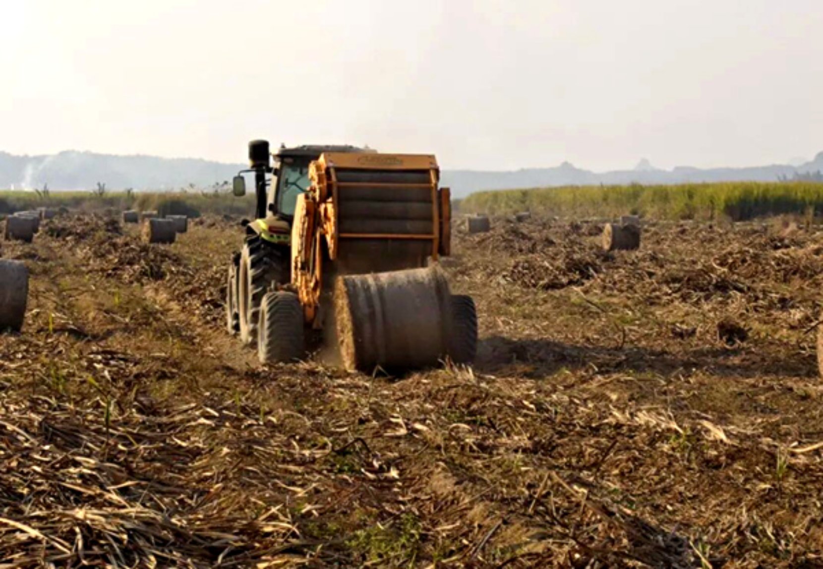 打捆机械穿梭蔗田,快速将散落蔗叶压实打包。