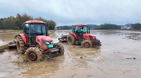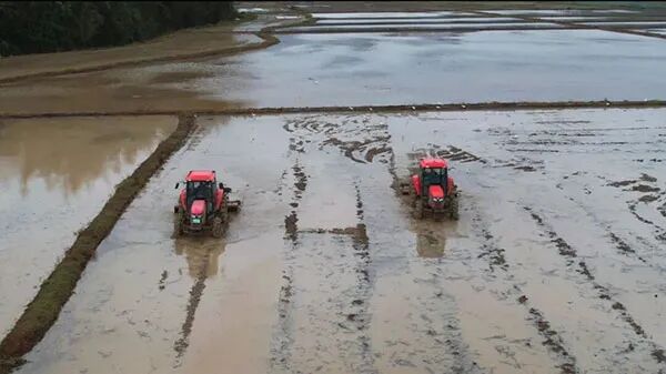 沙河镇长远村农户利用机械开展打田作业。李博 摄