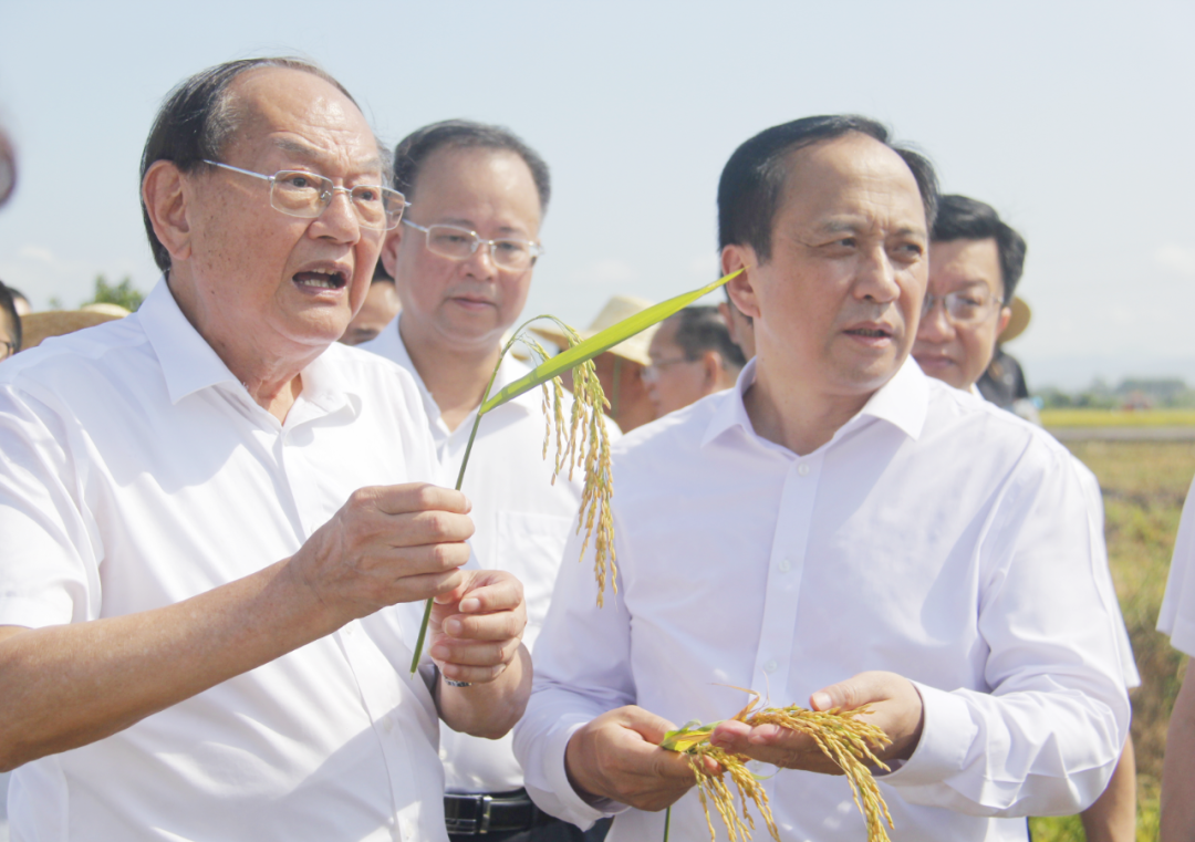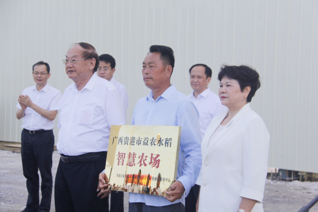 在推进会现场,罗锡文和李凤云共同为贵港市港北区益农农机专业合作社授牌“广西贵港市益农水稻智慧农场”。