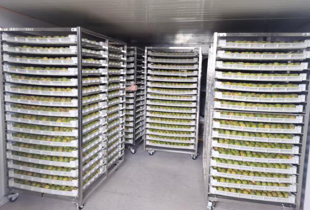3.传统热泵烘烤加工工艺:鲜果采摘→存放糖化→热泵烘烤→分级包装→成品入库(前两道工序和后两道工序与低温冻干工艺相同)