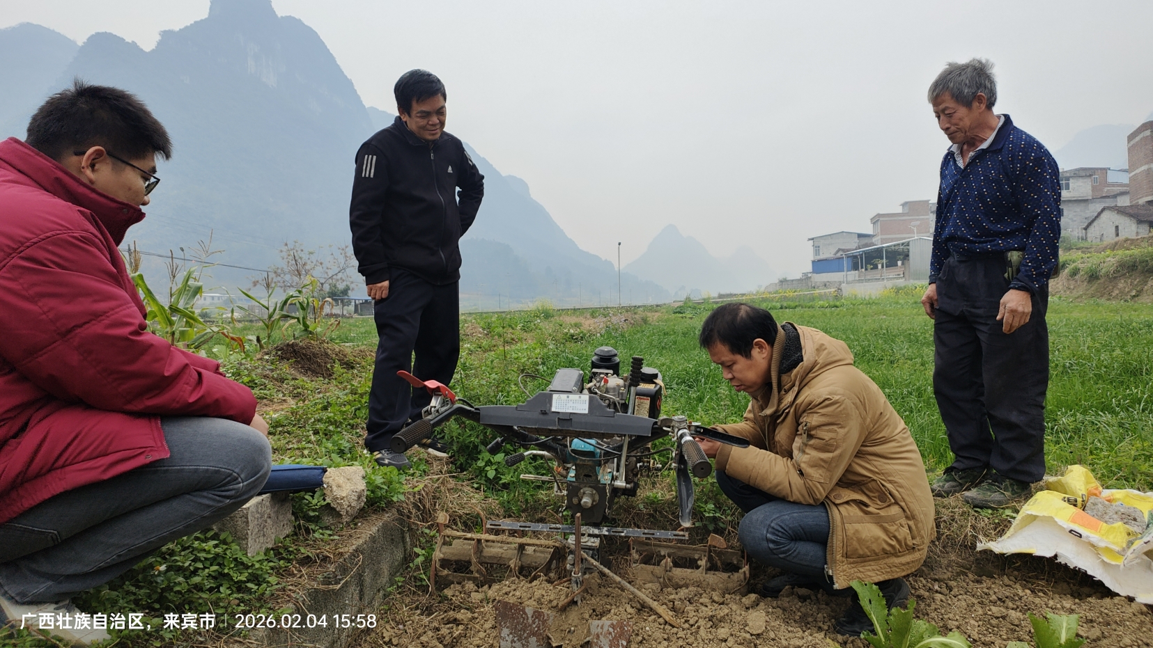 近日,在来宾市忻城县遂意乡琼古板新屯,农机技术人员手把手指导农户操作与保养小型农机具,将实用技术送到田间地头。