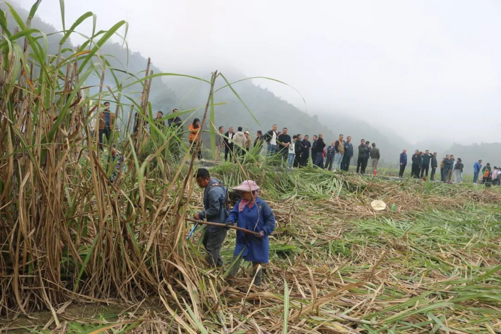 演示甘蔗收割过程。