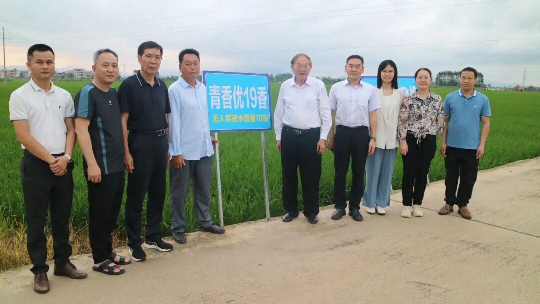 罗锡文院士(右五)在贵港市港北区益农农机合作社指导水稻无人农场建设