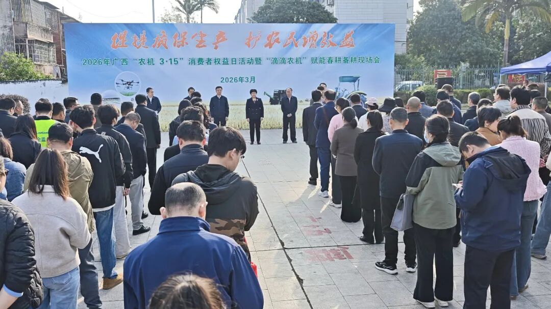 三月的桂中大地,春潮涌动,沃野复苏,正是春耕备耕的黄金时节。3月13日,2026年广西“农机3·15”消费者权益日活动暨“滴滴农机”赋能春耕备耕现场会在来宾市兴宾区隆重举行。本次活动以“促提质保生产 护农民增效益”为主题,旨在筑牢农机质量防线,维护农民合法权益,全面展示“互联网+农机”的创新模式,为全区春耕生产注入强劲的科技动能。