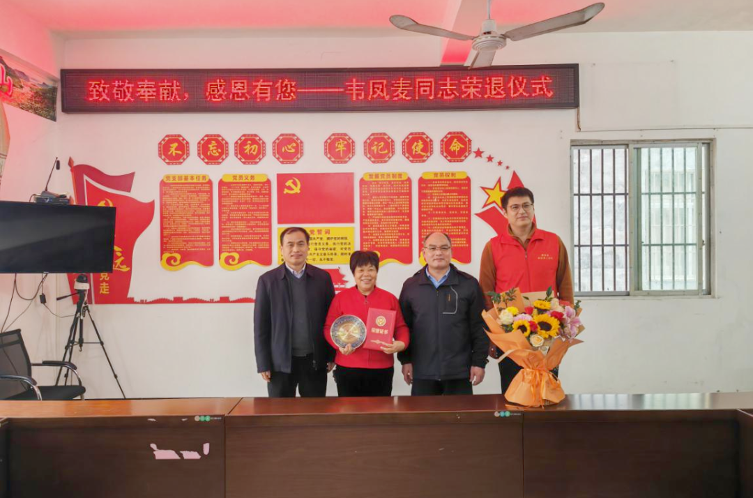 范军灿、潘立和为地同村党支部书记、主任韦凤麦举行荣退仪式并合影留念