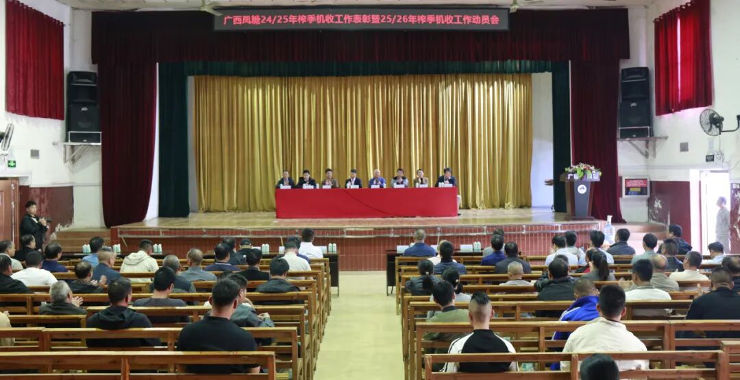 10月29日上午,广西凤糖2024/2025年榨季机收工作表彰暨2025/2026年榨季机收工作动员会在凤山糖厂大礼堂举行。广西凤糖公司领导、农务部相关负责人,各制糖企业分管农务相关负责人,广西凤糖扶持的合作社、种植大户代表等共同参加会议;会议特邀柳州市、柳城县农机中心领导,以及合浦惠来宝、江苏沃得、洛阳辰汉、广西柳工、黑龙江惠达、广西特勤工程机械管理中心、广西科技大学等企业和机构代表出席。