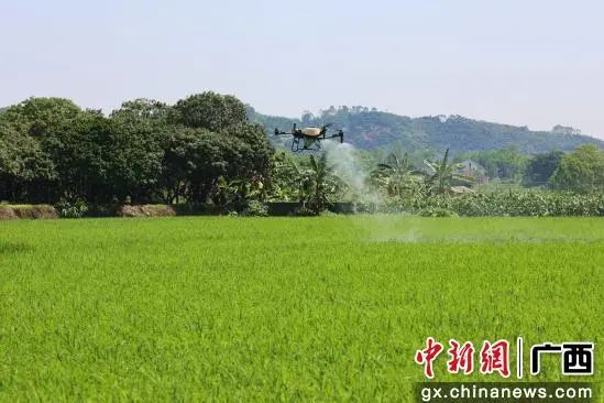 “嗡嗡嗡……”随着螺旋桨高速旋转的蜂鸣声,一架农业无人机从广西北流市新荣镇大同村的一处田埂上腾空而起,在操作员娴熟的操控下,无人机沿着规划好的航线低空穿梭,喷洒的药液形成细密雾帘,均匀地洒落在稻田上。