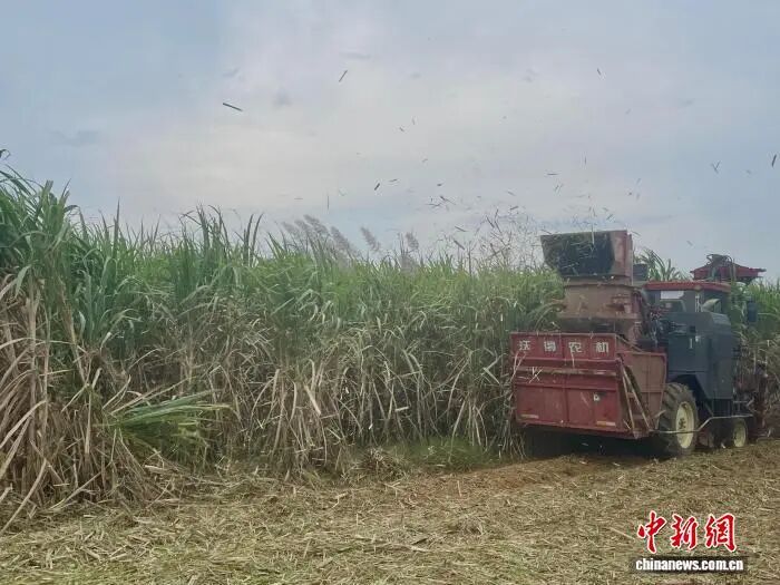 通过“滴滴农机”平台接单的收割机,正进行甘蔗机收作业。黄令妍 摄