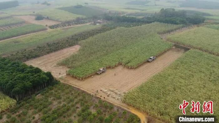 在糖料蔗基地里,蔗农们则一手握住甘蔗,一手持“电剪”轻轻按动开关,随着“滴”的一声,甘蔗离地。不一会儿,大片高耸挺拔的甘蔗林就被收割,一根根甘蔗整齐堆叠在田间地头。