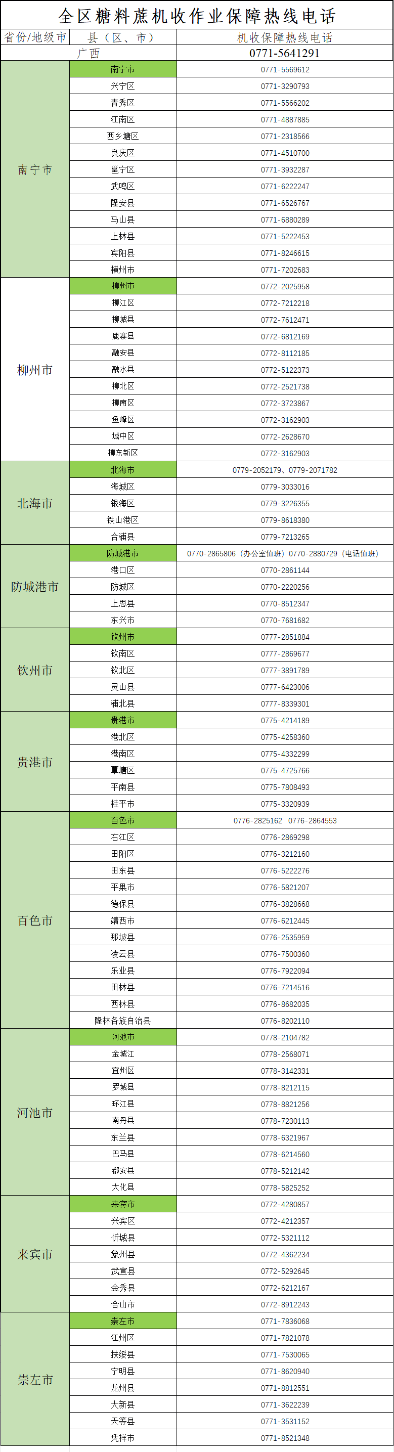 全区糖料蔗机收作业保障热线电话